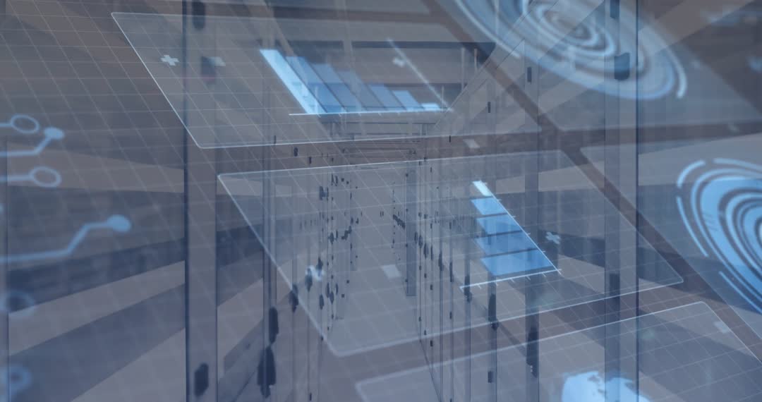 Illustrates digital data processing with overlays in a server room, creating a sense of innovation in technology. Perfect for use in topics related to artificial intelligence, big data management, cybersecurity awareness, or promoting advancements in data center technologies.