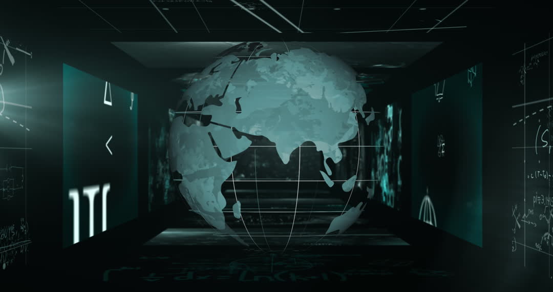 Futuristic animation depicting digital data processing with a luminous Earth globe, perfect for showcasing innovation in global business and technology industries. Useful for illustrating concepts of advanced networking, data analysis, and technological progress in presentations, promotional materials, or educational content.