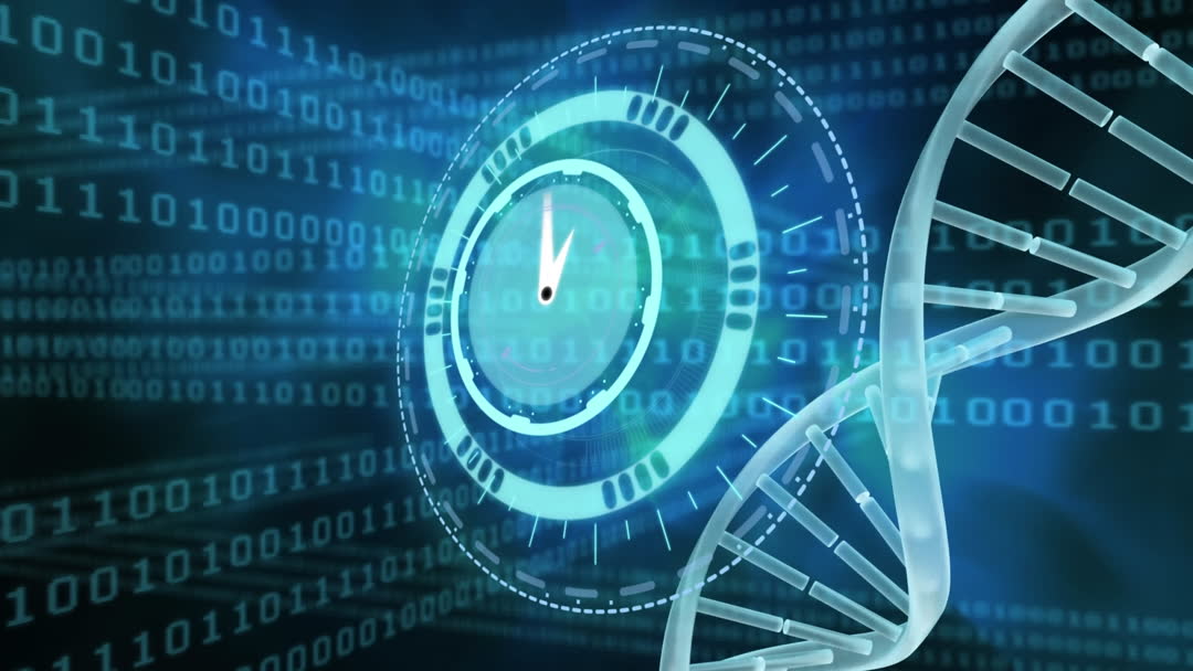 This animation features a neon clock ticking alongside a digital DNA structure and streams of binary code against a blue background. It conveys concepts like advancements in medical technology, biological computing, and futuristic research technologies. Useful for presentations on biotechnology, genetic research innovations, or technological advancement illustrations.