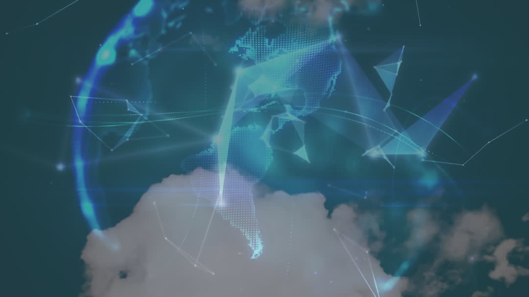 Animation depicts digital representation of Earth, featuring holographic elements with interconnected networks. Set against cloudy background, potentially symbolizing global connectivity and data exchange themes. Useful for presentations on technology, global communications, hardware, software, or visionary corporate projects.