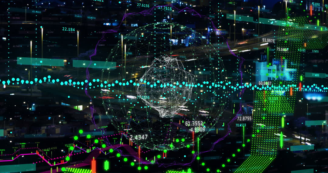 Innovative video illustrating a globe overlayed with complex data and networking visuals superimposed on an urban cityscape. Suitable for demonstrating modern technology, finance markets advancing analytics, or global connectivity in materials like websites, industry analyses, and tech presentations.