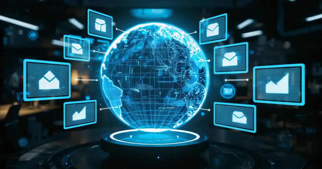AI Generated Image. This visualization represents a futuristic and interactive digital globe rotating above a platform, with data and icons connected through animated lines resembling database, email, and chart functionalities. The scene reflects cutting-edge technology and digital communication. It illustrates the concept of global data exchange and connectivity within a modern office or tech company setting. Suitable for presentations, videos on emerging technology, AI data applications, global connectivity business showcases, and tech promotions focusing on innovative insights.