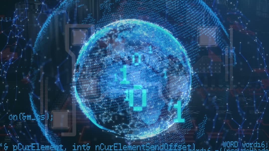 Animation features translucent digital globe encapsulating data streams and code, perfect for illustrating digital networks or global technology themes. Ideal for presentations, technology blogs, and educational videos exploring the concepts of data processing, artificial intelligence, or the digital age.