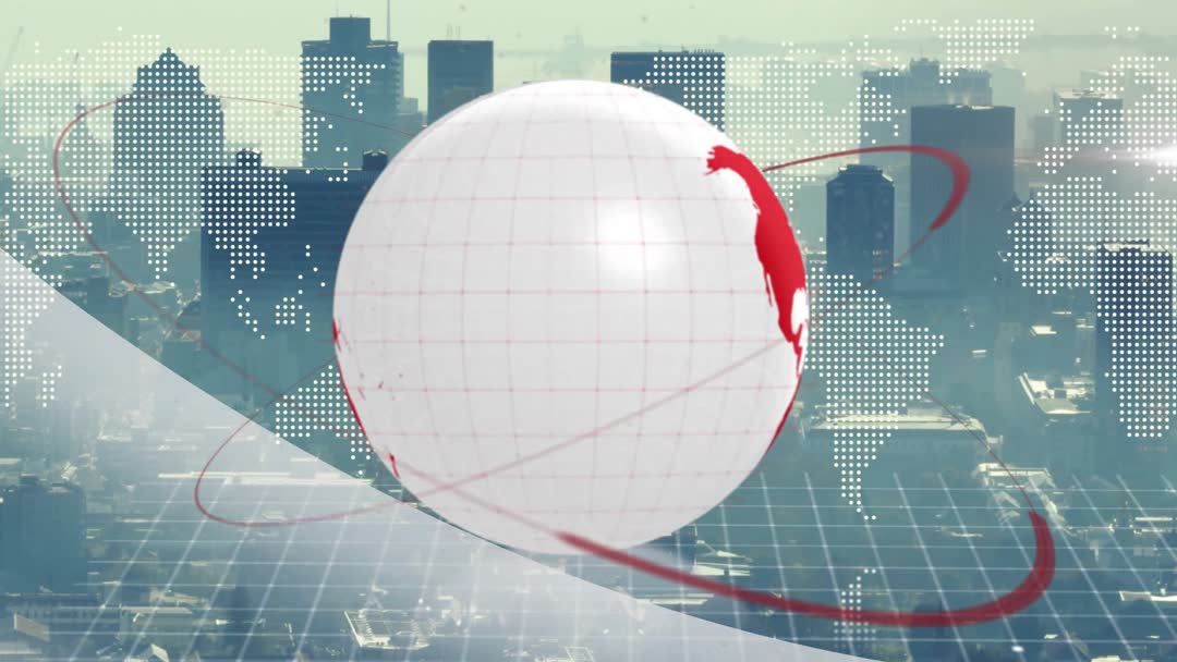 A digital globe spins above a grid plane, symbolizing global connectivity and innovation. Red orbit lines add a dynamic element against a backdrop of a modern urban skyline and dotted world map overlay. Useful for representing concepts of technology, data analytics, or futuristic communication in presentations, digital media content, and educational materials on global connectivity and technological advancements.