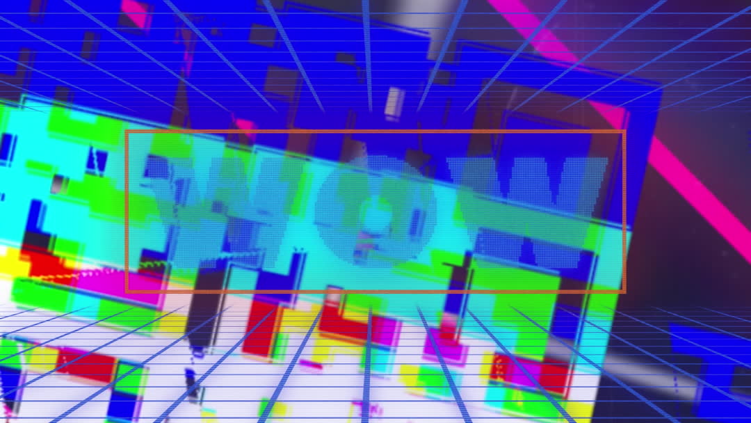 Dynamic digital grid featuring vivid neon graphics and geometric shapes overlaying a digital interface. The bold use of color and futuristic design elements enhances the modern technology theme, useful for presentations, tech-themed events, digital media, or creative marketing campaigns emphasizing innovation.