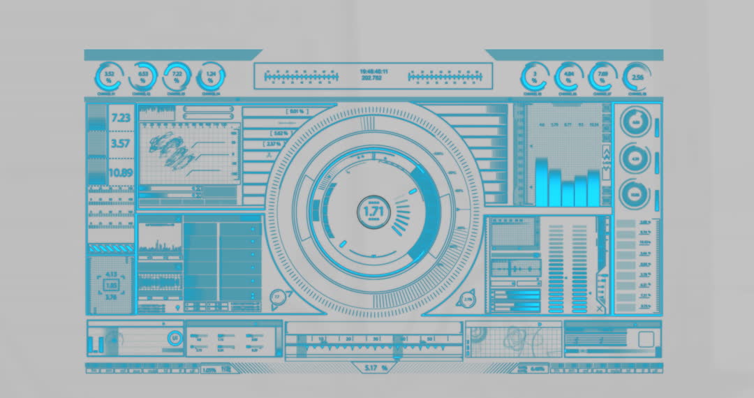 This stock video showcases a futuristic digital HUD interface used for data processing and technological applications. The design features multiple graphs, gauges, and digital readouts, creating a sci-fi aesthetic. Ideal for illustrating technological breakthroughs, data analysis, high-tech presentations, and sci-fi projects, this video conveys innovation and modernity.