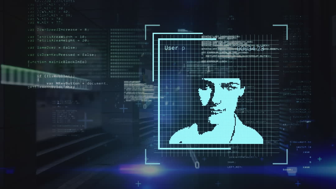 This high-tech visual represents a futuristic digital identity and data processing concept. The videory suggests themes of cybersecurity and technological innovation, showing an animated interface with digital data streams and scanning technology. Ideal for illustrating articles, presentations, or research on cybersecurity, privacy concerns, or digital futures in technology blogs or reports.
