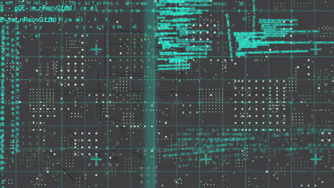 Digital display showcases futuristic technology concepts with animated coding and grid patterns. Ideal for illustrating articles or presentations on software development, programming trends, data visualization, or technological innovation. Enhances content related to high-tech applications or futuristic design aesthetics.