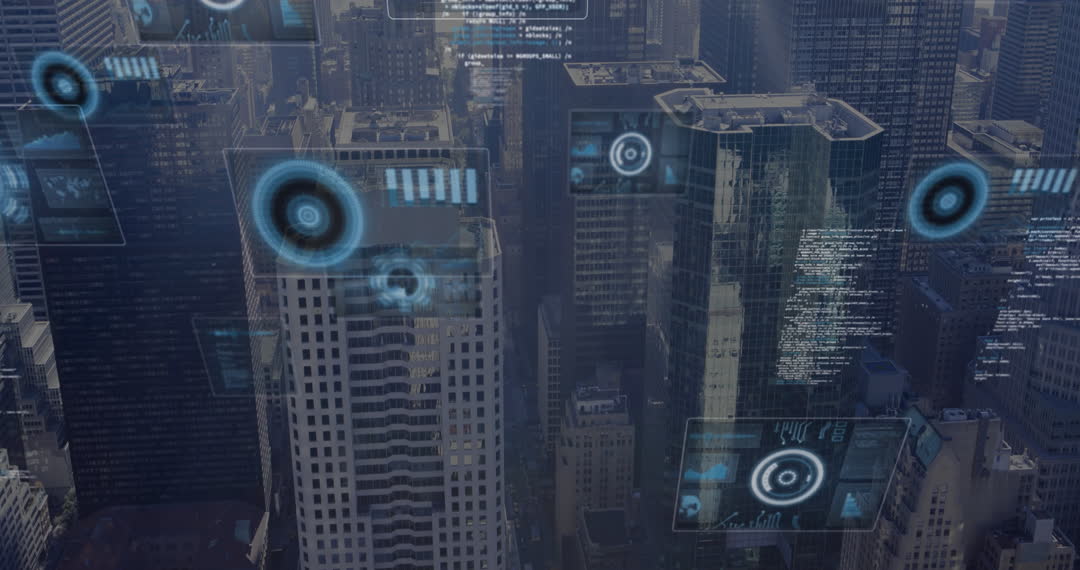 Futuristic digital interface elements are overlaying a bustling urban cityscape filled with skyscrapers. This visual suggests the integration of cutting-edge technology in a modern metropolis, demonstrating concepts of digital transformation in business. Ideal for illustrating themes related to technology advancements, modern city life, smart cities, and business innovation.