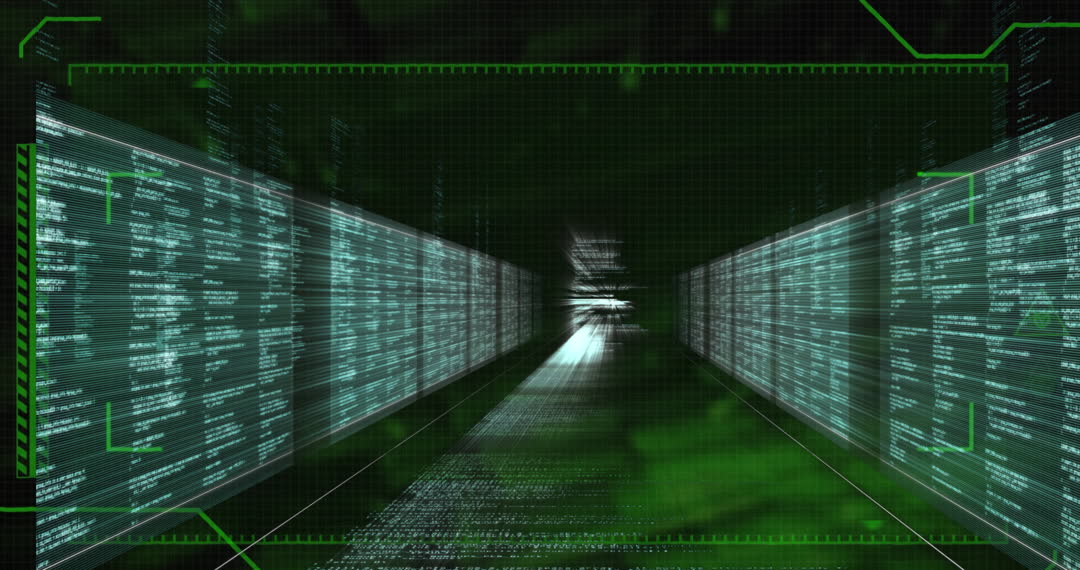This artwork depicts an advanced digital interface with streaming data code in a green hue, evoking the essence of cyber security and programming environments. The tunnel effect gives a sense of limitless virtual space, making the video suitable for contexts such as cybersecurity brochures, tech presentations, or articles focusing on data processing and software development.