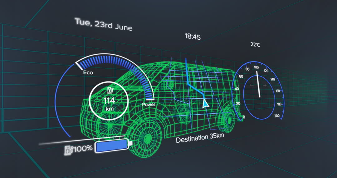 Depicts advanced technology with details on electric vehicle's current status such as eco levels, battery percentage, and destination tracking. Ideal for energy innovation themes, showcasing futuristic automotive technology and eco-friendly transport systems. Useful for presentations on electric vehicles, sustainability, or digital advancements in the automotive industry.