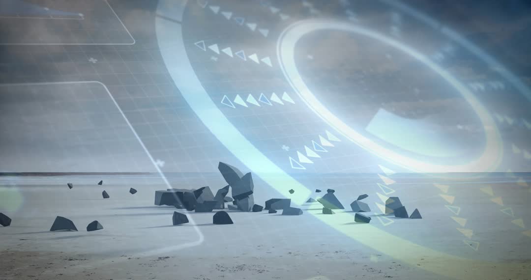 Futuristic digital interface overlays on rocky terrain with scattered geometric shapes. Ideal for themes related to technology, innovation, and science fiction. Can be used in presentations to convey concepts of virtual reality, network advancements, and digital innovations. Perfect for articles or websites focusing on futuristic design and technological progress.