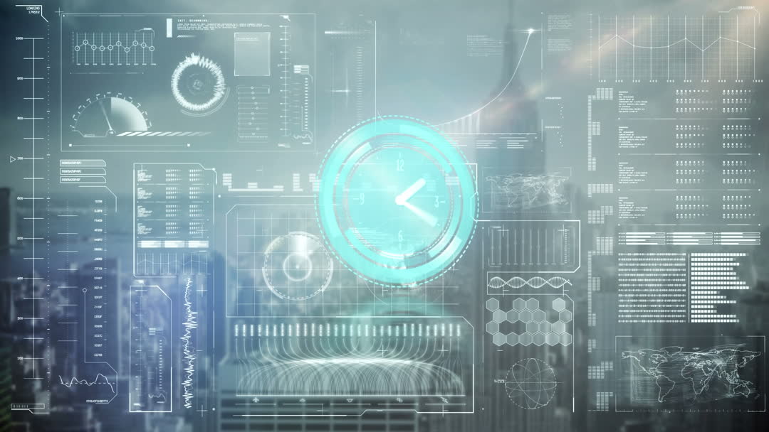 Image illustrates a high-tech digital interface with a mix of futuristic data analysis graphics and a centralized clock motif. Overlay style combines elements of a plotting diagram, graphs, charts, and scanning visuals. Useful for showcasing themes of innovation, technology advancements, global connectivity, or information systems in presentations, articles, or websites focused on tech industries.