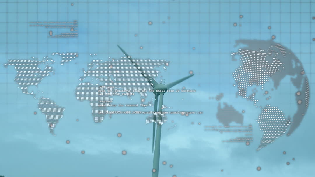 Abstract representation of a modern digital interface superimposed on wind turbine, symbolizing technological advancement and global communication networks. Ideal for illustrating themes of digital innovation, renewable energy solutions, or global connectivity in presentations or articles focused on green technology and digital transformation.