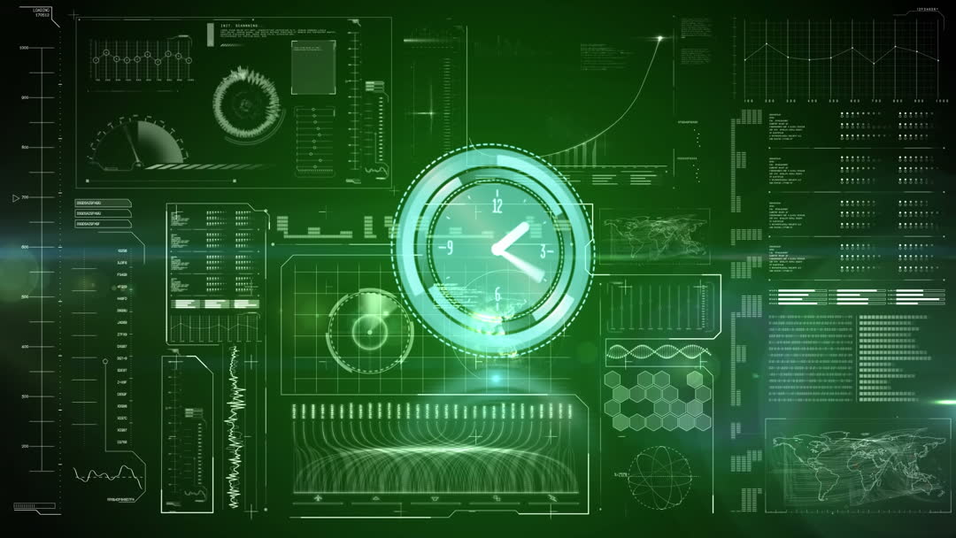 Digital interface displays animated clock with layered data graphics, combining time with technology and analytics visuals. It can be used in design projects related to tech innovation, digital analytics, time management solutions, and futuristic themes. Suitable for web banners, presentation slides, or as a visual metaphor in technology commercials.