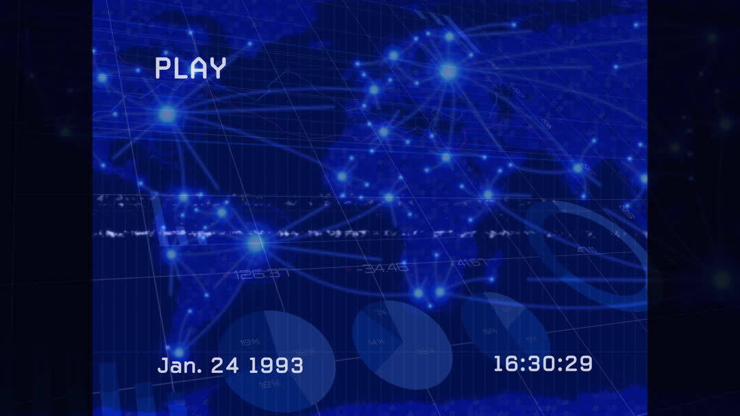 Design features an overlay of data processing visualizations on a world map with a digital aesthetic. This video is useful for tech presentations, global network concept illustrations, and advertising for data analysis software.