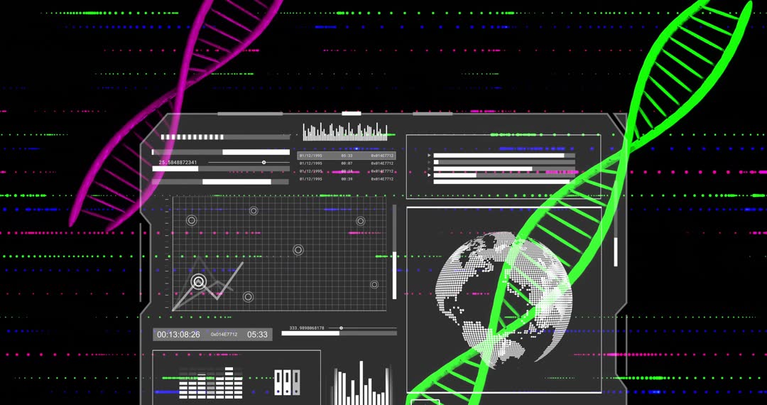 This visual captivates with a vibrant green DNA double helix intertwined across a sleek, modern heads-up display (HUD). The interface shows a pixelated globe along with various UI panels and bar graphs, creating a sense of advanced technology and scientific prowess. Eye-catching neon scatters in the background, highlighting innovation and the intersection of digital advancement and biological data. Ideal for use in presentations about biotechnology, futuristic concepts, innovative networking, and cyber analytics. Appropriate for marketing materials associated with tech companies and scientific research papers.