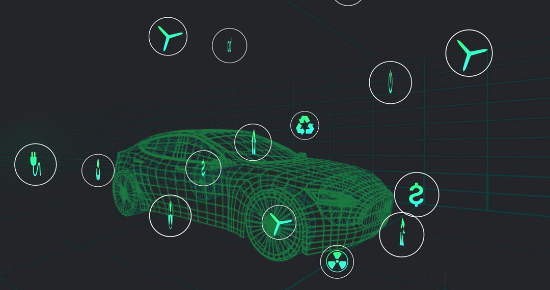 Illustration portrays a digital grid with symbolic icons representing sustainable technology and automotive innovation. Useful for presentations on eco-friendly car technology, advancements in digital dashboards, and the future of renewable energy in automobiles.