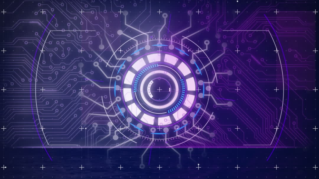 Futuristic digital interface features complex circuitry and central processing animation in purple tones. Incorporating technology and data themes, this is ideal for presentations, background visuals for AI, tech conference materials, or industry publications focusing on digital transformation and innovation.