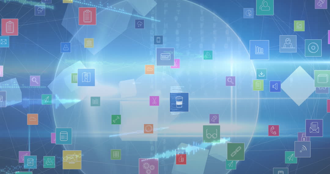 This illustration features a collection of colorful media icons over a dynamic blue digital interface background. Essential for technology presentations and digital concept conveyance, suitable for topics involving global business, networking, and information sharing. Ideal for use in presentations, website graphics, or ad campaigns offering a modern and tech-savvy vibe.