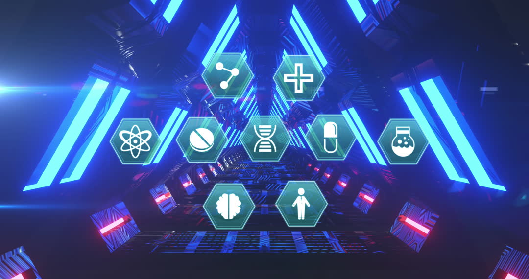Various medical symbols, including pills, DNA helix, and brain, appear over a brightly lit digital tunnel, symbolizing advanced technology's impact on healthcare and medicine. Useful for themes related to future of medicine, digital health solutions, innovations in biotech, and technological advancements in healthcare.
