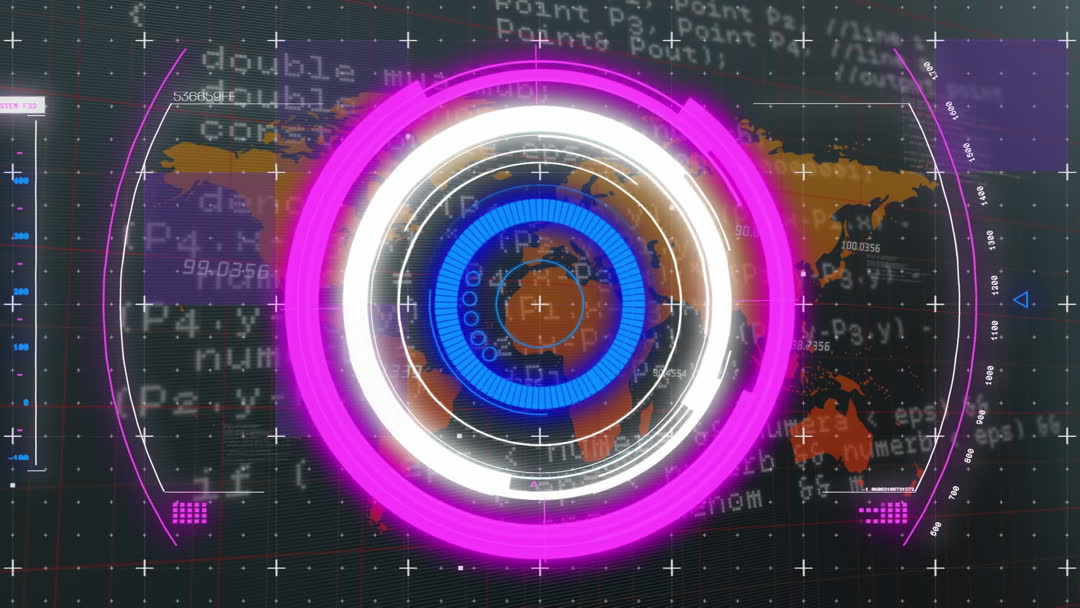 Abstract digital animation showing neon round scanner overlaying a world map with lines of code. Vibrant colors emphasize high-tech, modern design perfect for illustrating concepts related to cyber security, data analysis, globalization, or future technology trends in videos and presentations.