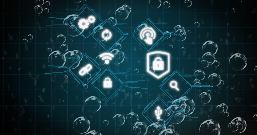 This striking setup showcases various network security icons representing data protection, interconnected over a dark background. Perfect for illustrating concepts around cybersecurity, internet safety, secure networks, and digital technology in presentations, websites, and educational materials focused on modern information security systems.