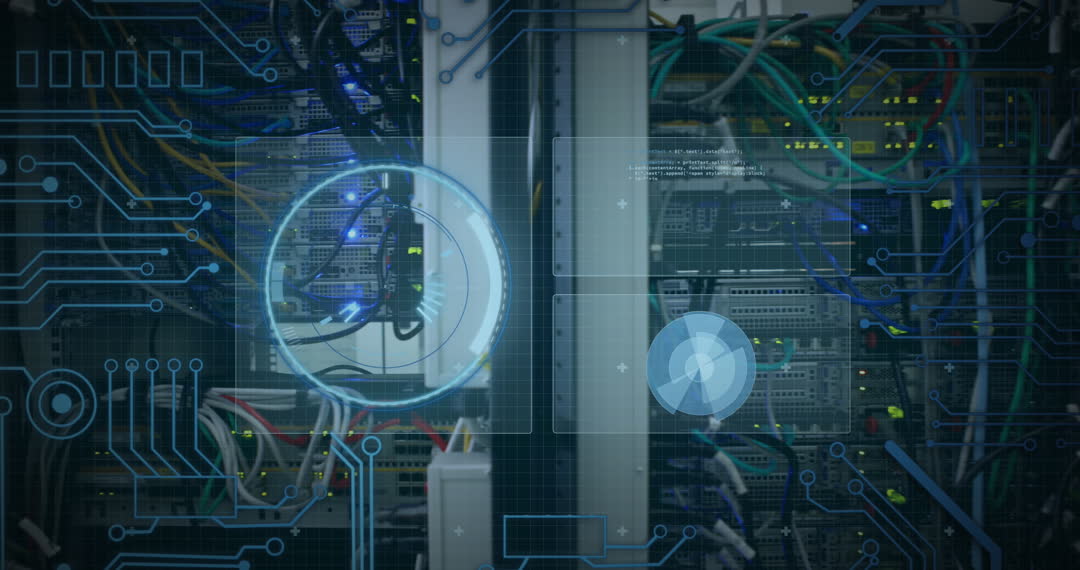 Animation depicts a high-tech digital interface overlay on network servers, showcasing data connectivity and modern digital processing. Ideal for illustrating concepts in technology promotion, IT solutions, data analytics, and digital innovation presentations.