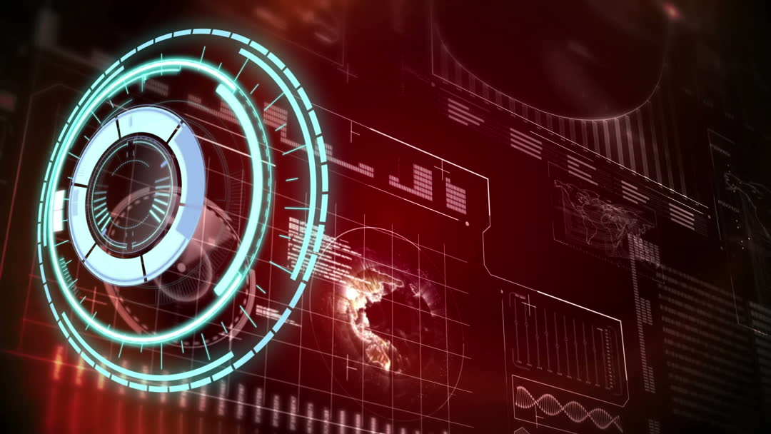 The visual depicts a futuristic looping animation featuring a rotating holographic scanner overlayed on a dynamic digital interface with environments suggesting data processing and network connectivity usage. A striking red background sets off technological textures and varied informational graphs offering links to concepts. This thematic element serves content illustrating bleeding edge technology trends assuredly connecting rapidly forwarding into stories about industry matters enveloping cybersecurity vital checks or inbound conveyor developments centering technological drama thriving on encryption strategies noticeably enhanced traffic visibility views actively shackled systems teaching enthusiasts trends consequently inspiring creators dramatized plots impending adventurous media hookups.