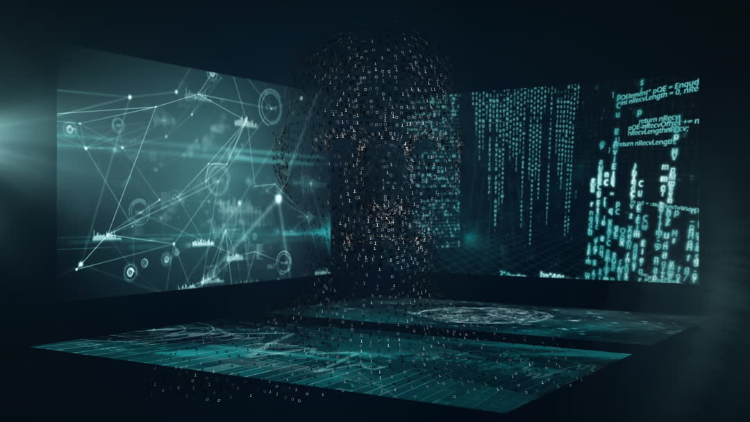 Animation depicting futuristic technology with complex data streams and digital representation of human biology inspires ideas of innovation and advanced analytics. Suitable for illustrating concepts in fields like technology, data science, artificial intelligence, and healthcare. Can be used in presentations highlighting innovation in scientific research or future technology advancements.