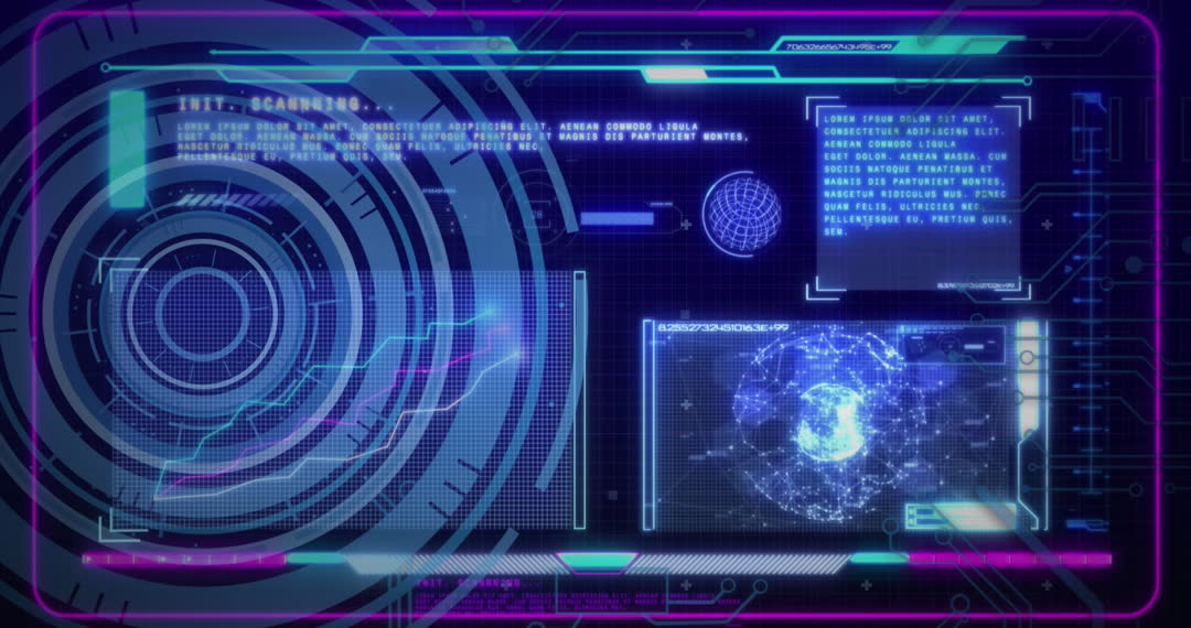 The video portrays a high-tech digital user interface with elements of scope scanning and financial data visualization. Vivid blue neon tones highlight various digital graphics, creating an aura of advanced technology. Ideal for conveying modern digitalization themes, it can be used in technology presentations, business strategy visuals, futuristic UI design examples, and sci-fi themed projects.