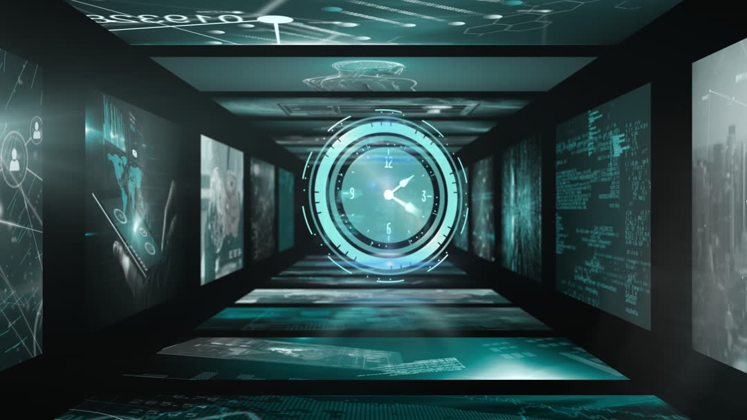 Futuristic Digital Interface with Virtual Clock Overlay Video
