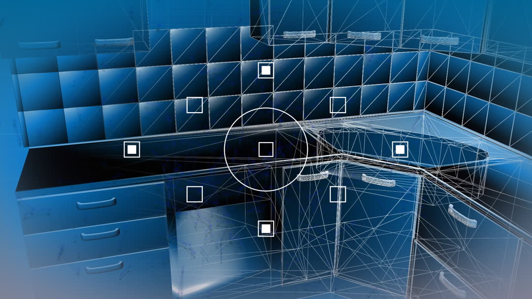 Illustration showcasing a futuristic interpretation of digital processing in kitchen design, combining elements of animation and engineering with focus points arrayed across the workspace. This is useful for articles or content focused on advanced kitchen technologies, digital design, interior design planning innovations, or smart home development projects.