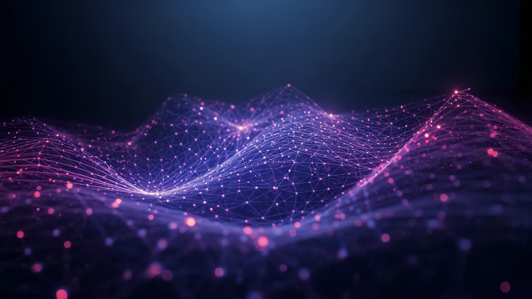 AI Generated Image. An emerging three-dimensional mesh rises and falls in a stylized digital void, representing a complex network of data communication. This dynamic video snippet features vibrant, pulsing lights that evoke a sense of modern technology and innovation. Ideal for presentations and media projects related to technology, data analytics, artificial intelligence, and digital transformation. Use it to enhance visuals for tech events, digital marketing materials, or educational content on futuristic technologies.