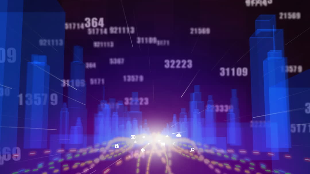 Abstract visual of a metaverse city with streaming numbers, representing concepts of digital data and technology. The vibrant hues and light effects suggest data processing and virtual environments. This is ideal for backgrounds in presentations on technology innovations, digital networking, and futuristic concepts.