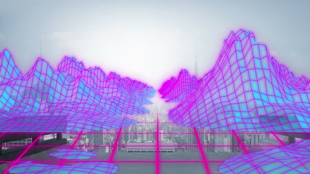 Vibrant digital art animation depicts neon-colored virtual mountains overlaying a cityscape, symbolizing technology and data processing concepts. Ideal for use in presentations about digital transformation, technology development, or virtual worlds. Brings a futuristic and stylish vibe to any tech-based content.