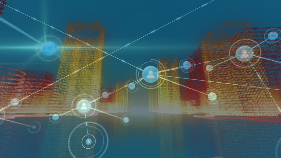 Highly detailed animation illustrating a digital network connecting virtual icons over a modern 3D cityscape on a blue backdrop, showcasing advanced technology and data management. Ideal for use in content related to global connections, smart city technology, networking, and digital transformation presentations or visual media.