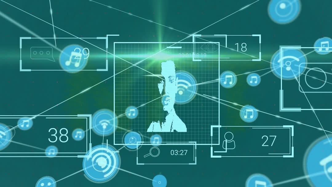 Graphic depicts a futuristic digital interface with interconnected icons like music notes, cameras, and social profiles, illustrating a high-tech network. Suitable for themes around digital connectivity, tech innovation, or multimedia interactions in presentations or digital media platforms.