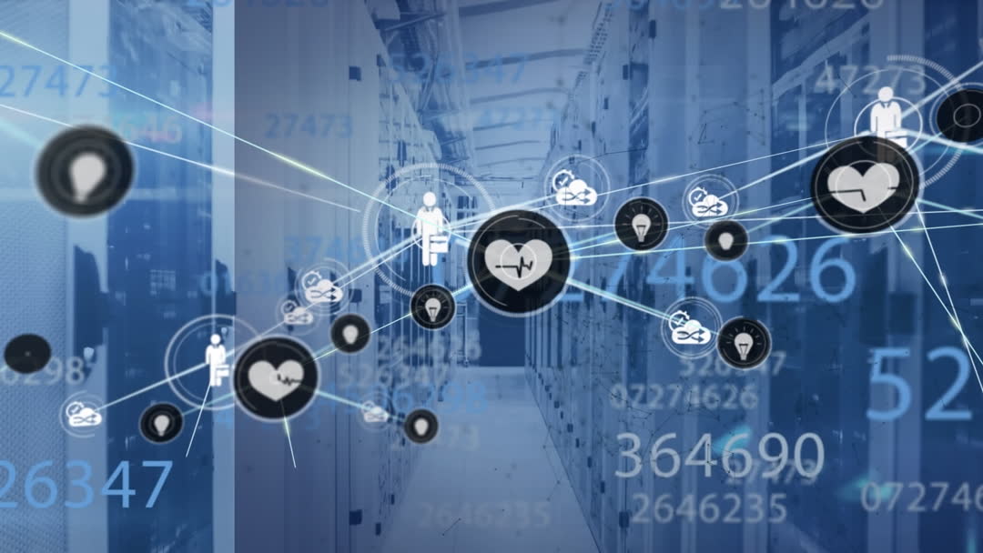 This visual depicts a digital network with animation of connections, accompanied by various tech-related icons such as hearts and users, overlaid on video of server room. Illustrates interconnectedness of modern digital systems and information flow in technological settings. Suitable for use in articles about data security, networking technologies, tech industries, and innovative computing solutions.
