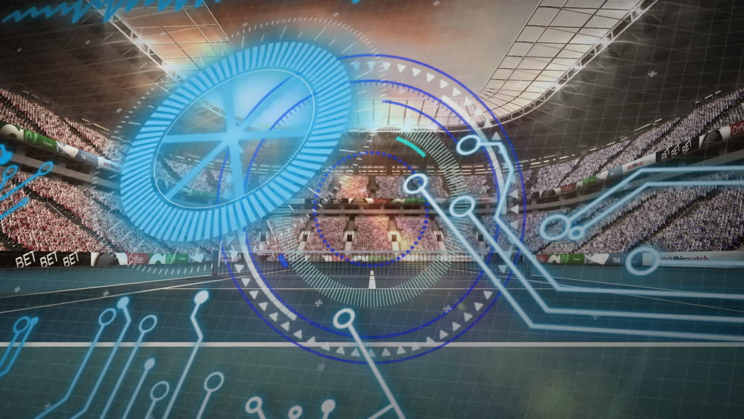 Futuristic Digital Network Overlay on Sports Stadium Video