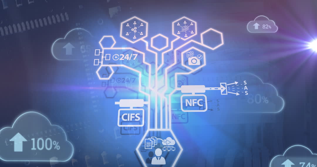 Displaying an innovative digital network theme with various business technology icons. Emphasizing cloud computing and connectivity through symbols like NFC and CIFS within a luminous digital setting. Great for illustrating future technology concepts, digital transformation in business settings, cloud solutions, and online security solutions.
