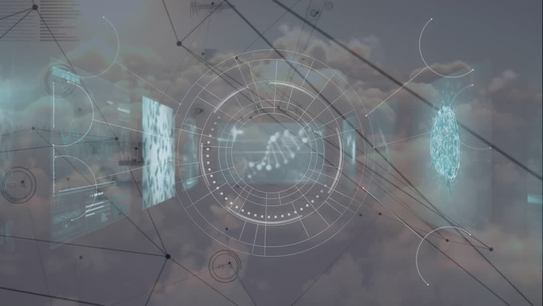 Visual representation of a digital network featuring data interfaces and connections overlaid on a cloud background. Ideal for illustrating concepts related to virtual networks, digital transformation, and cybersecurity in corporate presentations, educational materials, or digital marketing campaigns focused on innovation and technology advancement.