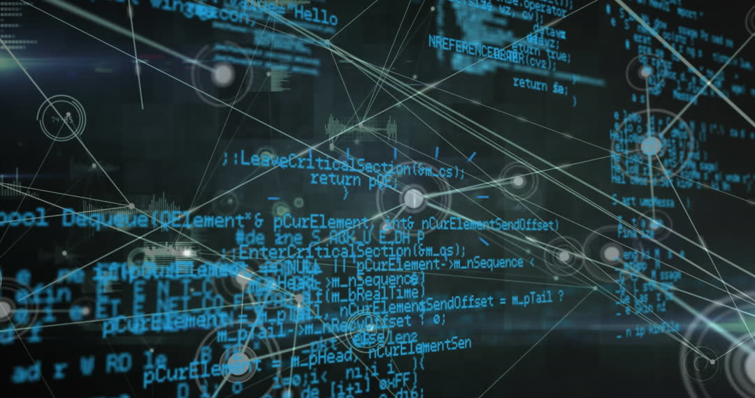 Abstract representation of a complex digital network with connections, data nodes, and programming code overlayed on dark background. Suitable for illustrating concepts in technology advancements, cybersecurity awareness, and digital communication. A great choice for presentations, educational materials, or websites about computer science, programming, and IoT.