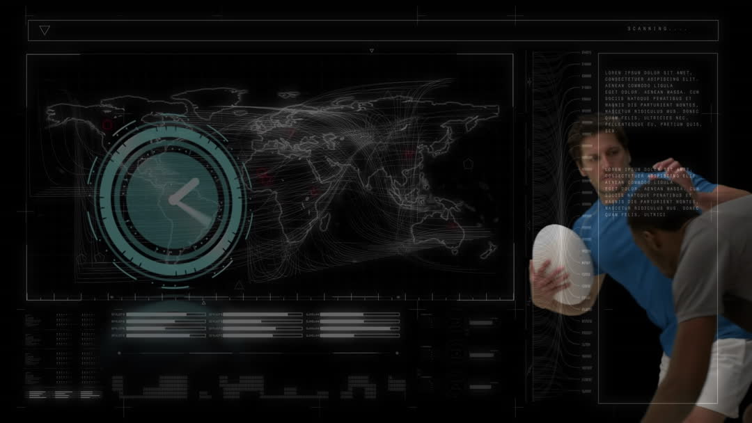 - Futuristic Digital Overlay on Rugby Game Featuring Time and World Map