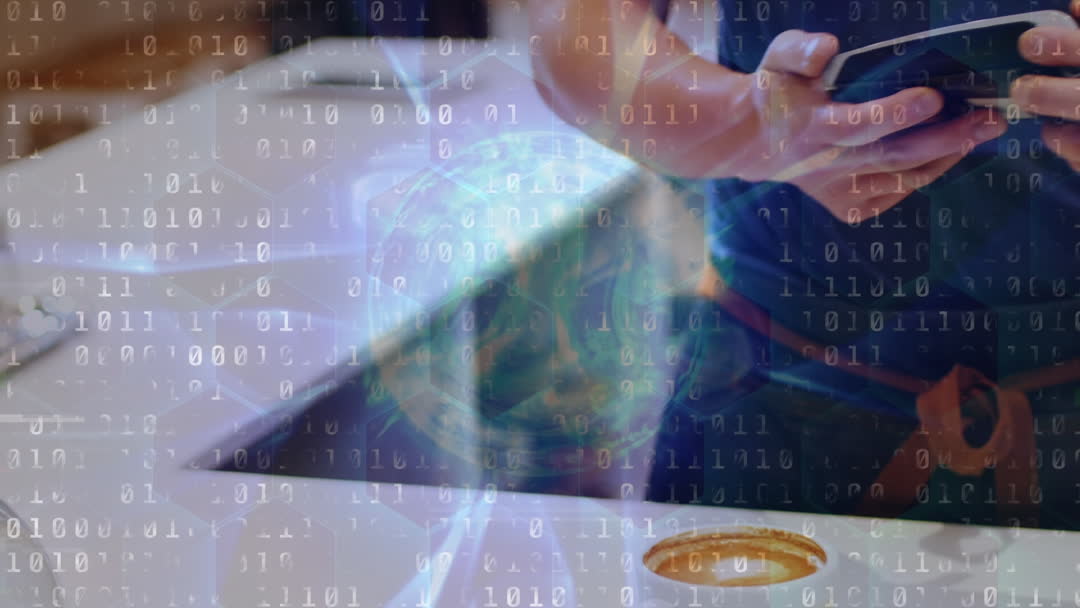 Visual depicts a Caucasian male using a smartwatch for making a digital payment, with an overlay of binary code, symbolizing technology and innovation. Highlights themes of modern finance and secure, contactless transactions. Useful for publications or content focusing on advancements in financial technology, cashless society trends, or general innovation in digital payments.