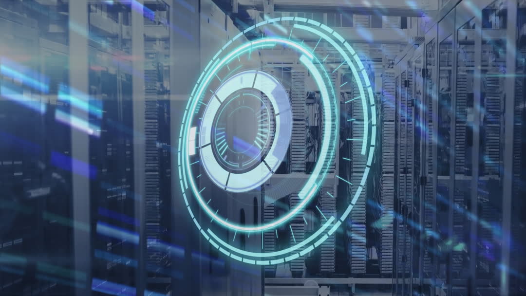 Animated digital processing circle lights spinning over modern server racks. Depicts advanced technology and data management concepts. Useful for illustrating themes related to digital transformation, cloud computing, networking, and artificial intelligence in marketing materials and tech feature articles.