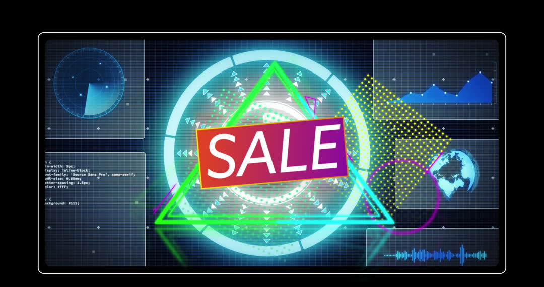 Dynamic visual featuring a futuristic interface with data graphics and central sale text. Ideal for promotional materials, advertisements, e-commerce design, and digital marketing campaigns targeting tech-savvy audiences.