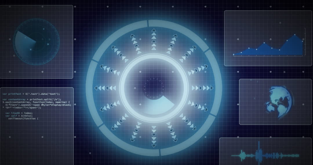 This video shows an advanced digital interface featuring a round neon scanner dashboard with integrated data analytics visualizations against a blue background. Ideal for presentations or articles related to technology, data analytics, software development, or futuristic design concepts. Useful for tech industry insights, digital user interface designs, or promotional materials emphasizing innovation and high-tech environments.
