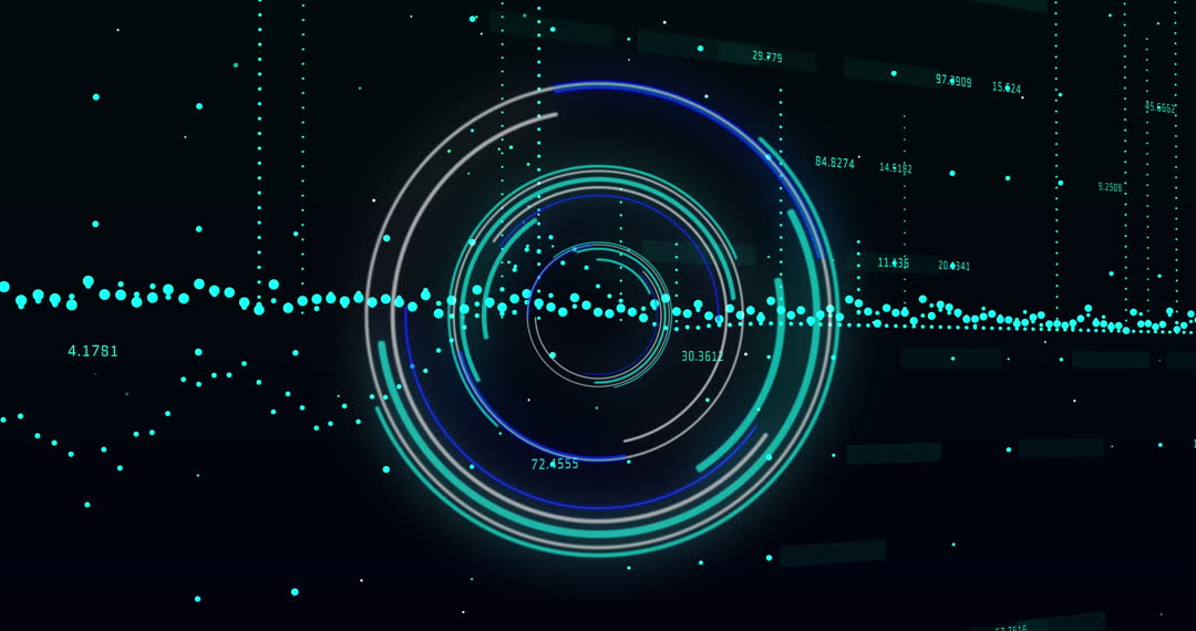 Dynamic animation depicting futuristic scope scanning for financial data analysis, featuring complex circular patterns and numeric data points. Useful for presentations on data analysis, financial technology innovations, or global business strategies.