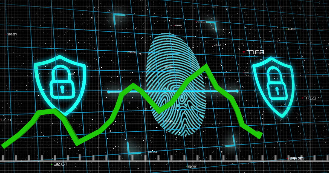 Neon fingerprint and lock icons convey themes of cyber security and data protection on virtual grid backdrop. Green line graph indicates data trends or analysis, regularly used for illustrating concepts in technology, statistics manuals, online security applications, or cyber security education content.